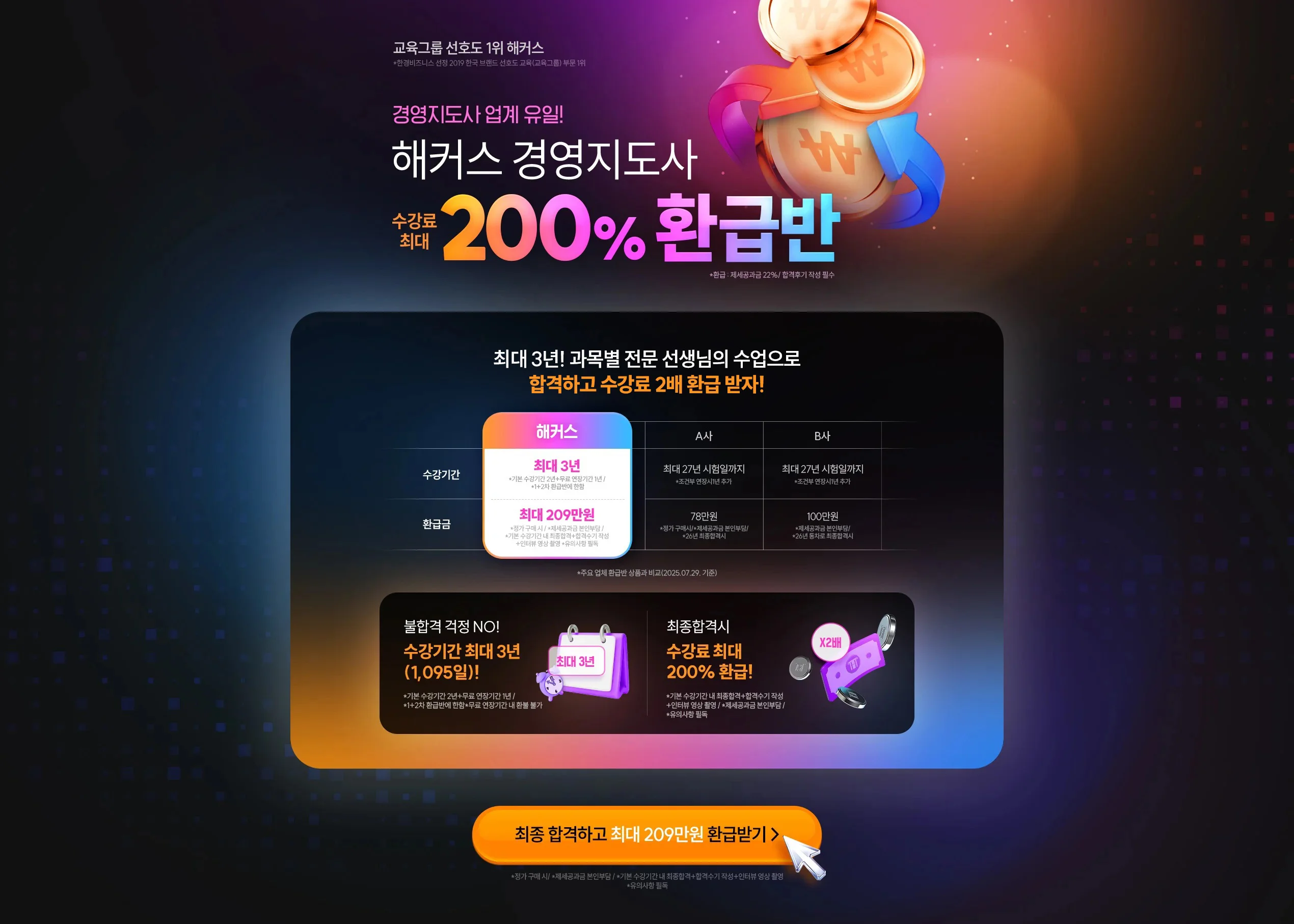 2) 200% 환급 조건 : 기본 수강기간인 730일 내 시행된 시험에 응시하여 최종 합격+합격수기 작성+인터뷰 영상 촬영 +관련 서류 제출시 가능