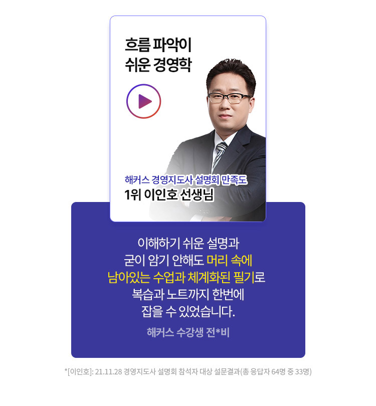 - 해커스의 좋은 커리큘럼 때문에 해커스 경영지도사 과정을 선택하게 되었습니다. - 경영지도사 합격자 김*진